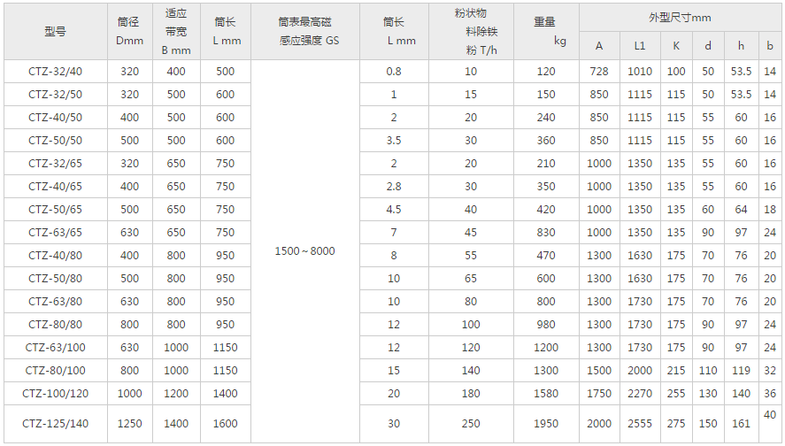 CTZ型中場強(qiáng)半磁滾筒(CTZ型中場強(qiáng)全磁滾筒結(jié)構(gòu)與RCT型參數(shù)等同),多用于對粉狀、顆粒狀、小塊狀物料的凈化處理,或?qū)﹁F質(zhì)的回收利用,對防止研磨機(jī)、壓榨機(jī)的破壞和磨損起著可靠的保護(hù)作用。它安裝方便、吸力強(qiáng)、低能耗、連續(xù)工作、操作簡單。