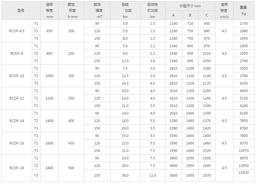 RCDF型油冷自卸式電磁除鐵器是在RCDE系列除鐵器的基礎增加了驅動電機、滾筒、帶刮板的卸鐵膠帶等組成的卸鐵機構。具有磁力大、散熱快、防塵、防雨、耐腐蝕、連續工作、維護費用低等優點。