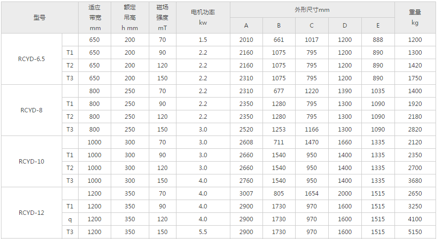 RCYD型永磁自卸式除鐵器與RCYC系列型號等同,適用于各行業輸送帶輸料除鐵。可實現連續不斷的吸棄鐵。皮帶具有自動糾偏功能,運行可靠、維護簡單。其內部磁路采用完善的結構,保障整機在惡劣環境中無故障長期運行。擁有防爆型和鎧裝型。