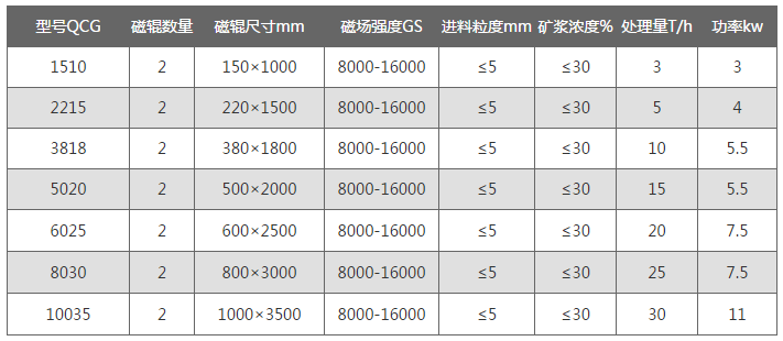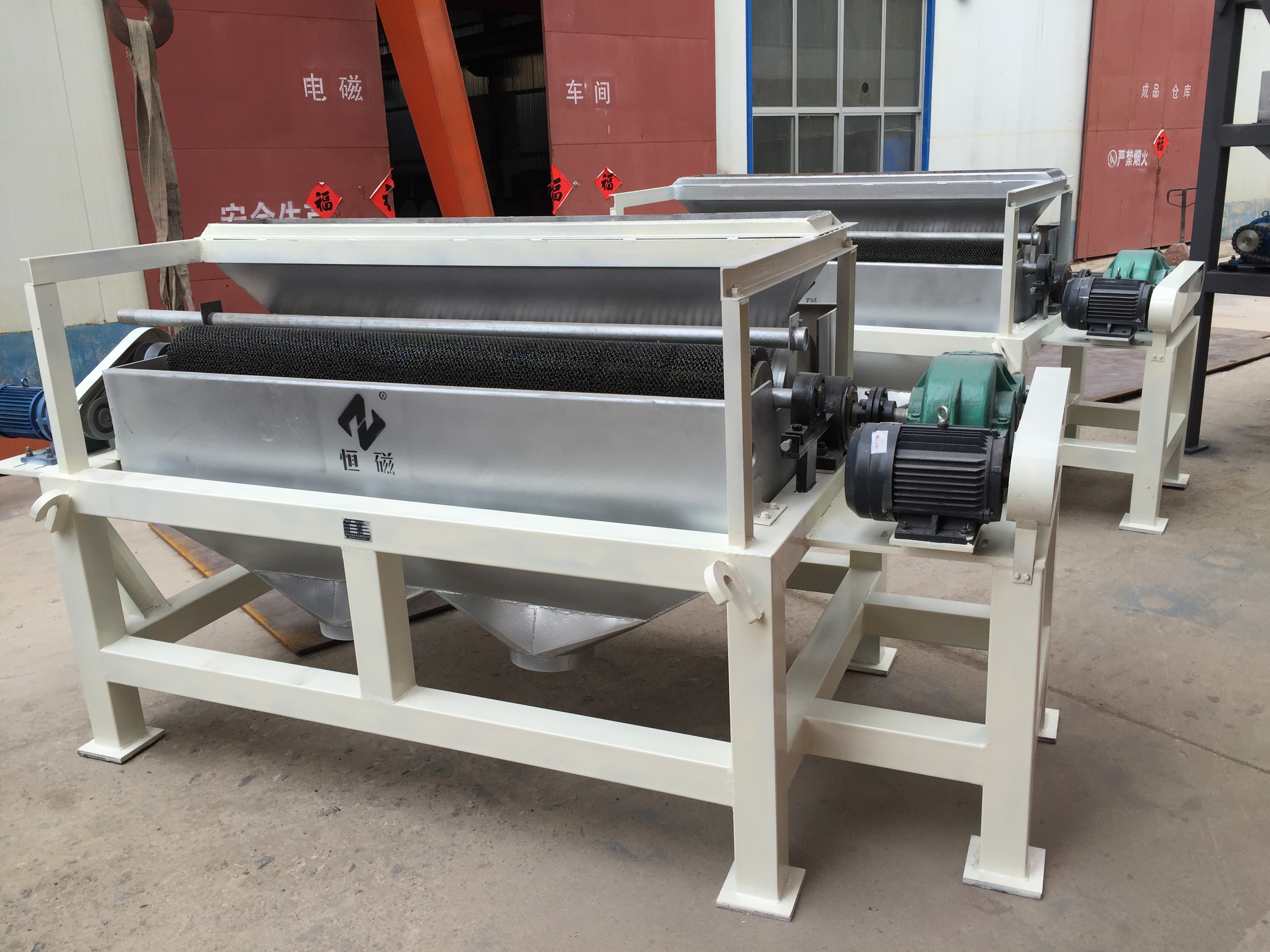 其原理為物料經(jīng)料倉通過導(dǎo)料盤進(jìn)入磁場區(qū),磁性礦物被吸附在磁輥表面旋轉(zhuǎn)到達(dá)精礦區(qū),毛刷將吸附在磁輥表面上的磁性礦刷脫,在高壓水的噴射下落到精礦斗里,部分未被吸附的磁性礦粒、非磁性礦粒和磁性較弱的礦粒進(jìn)入到再選,個(gè)實(shí)現(xiàn)10輥組合,可對物料進(jìn)行多達(dá)10次的分選,特別是對強(qiáng)磁性、中磁性、弱磁性共存礦物有顯著的分選效果。